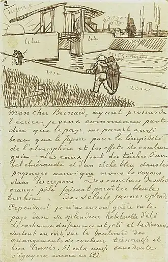 Deși se crede că van Gogh este maestrul liniilor curbe, schițele tablourilor, realizate direct pe scrisorile trimise de el, sunt compuse în întregime din linii drepte. Desenele induc în eroare și nimeni nu s-ar gândi că au fost trasate de van Gogh. Într-o scrisoare trimisă fratelui său, Theo, pe 31 iulie 1882, pictorul explica procesul din spatele unei acuarele, dublând tabloul cu o schiță realizată în cerneală și cărbune.[140]