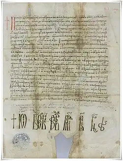 ![Ducat emis in vremea lui Vlaicu Vodă în Muntenia; avers: scutul fasciat al Basarabilor și inscripția latină WLADISLAI WAIVODA +; revers: stema Țării Românești (un corb așezată pe coif) și legenda TRANSALPINA, în traducere: „[Lui] Vladislav Voievodul [țării] de peste Munți”](../I/DUCATMUNTENESC1300InscriptieLAtina-Model2.png)