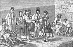 ![]() O țărancă română (paysanne valaque) desenată de Dieudonné Lancelot în 1860 |