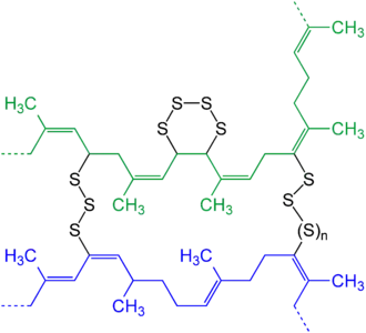 Reprezentare schematică a două catene (albastră și verde) de cauciuc natural și modul în care acestea s-au legat după vulcanizarea cu sulf.