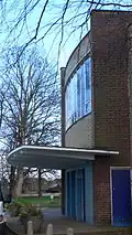 Imagine 2 - Walter Gropius --- Intrarea clădirii Bauhaus din Dessau, exemplu superb de "transparență" totală.