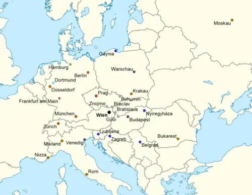 Harta stațiilor terminus ale trenurilor care pleacă din gara centrală, din Viena (Wien Hauptbahnhof)