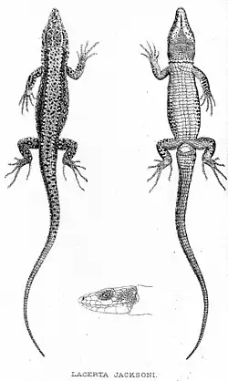 - Greenbaum, E., Beer, S.D., Hughes, D.F., Wagner, P., Anderson, C.G., Villanueva, C.O., Malonza, P.K., Kusamba, C., Muninga, W.M., Aristote, M.M. & Branch, W.R. 2018. Phylogeography of Jackson's Forest Lizard Adolfus jacksoni (Sauria: Lacertidae) Reveals Cryptic Diversity in the Highlands of East Africa. Herpetological Monographs 32(1): 51–68. DOI: 10.1655/HERPMONOGRAPHS-D-18-00005.1