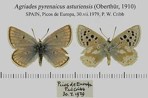 - Polyommatus (Agriades) pyrenaicus asturiensis (Oberthür); Bridges, 1994: VIII.49.