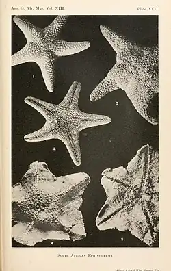 - Mortensen, O.T.J. 1933. Echinoderms of South Africa (Asteroidea and Ophiuroidea). Papers from Dr. Th. Mortensen's Pacific Expedition 1914—16. LXV. Videnskabelige Meddelelser fra den Naturhistoriske Forening i Kjøbenhavn. 93: 215–400; pl. VIII–XIX. PDF. Reference page. [as Anseropoda (Palmipes) habracantha p. 251]