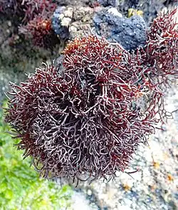 - Hooker, J.D. & Harvey, W.H. 1845. Algae Novae Zelandiae; being a catalogue of all of the species of algae yet recorded as inhabiting the shores of New Zealand, with characters and brief descriptions of the new species discovered during the voyage of H.M. discovery ships "Erebus" and "Terror" and of others communicated to Sir W. Hooker by D. Sinclair, the Rev. Colenso, and M. Raoul. The London Journal of Botany 4: 521–551. BHL Reference page. : 549