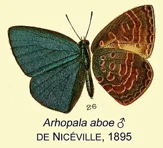 - Arhopala aboe de Nicéville, 1895: 281, pl.O, fig.26.