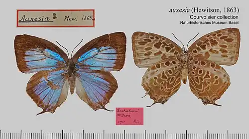 - Amblypodia auxesia Hewitson, [1863]: 5, pl.1 figs 1-3.