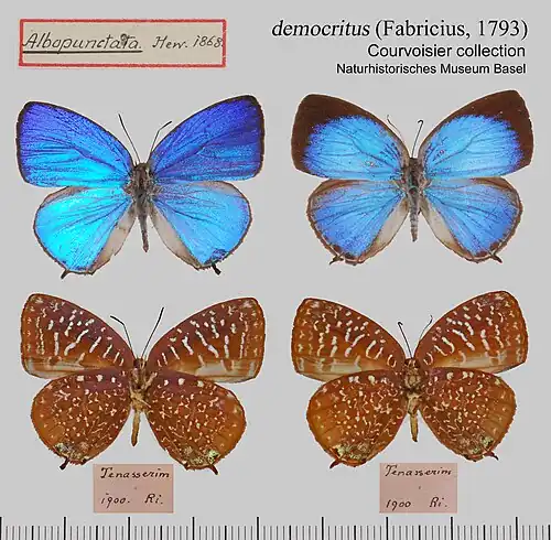 - Amblypodia albopunctata Hewitson, [1869]: 14e, pl.3b, figs 43,44. TL Burma, Moulmein.