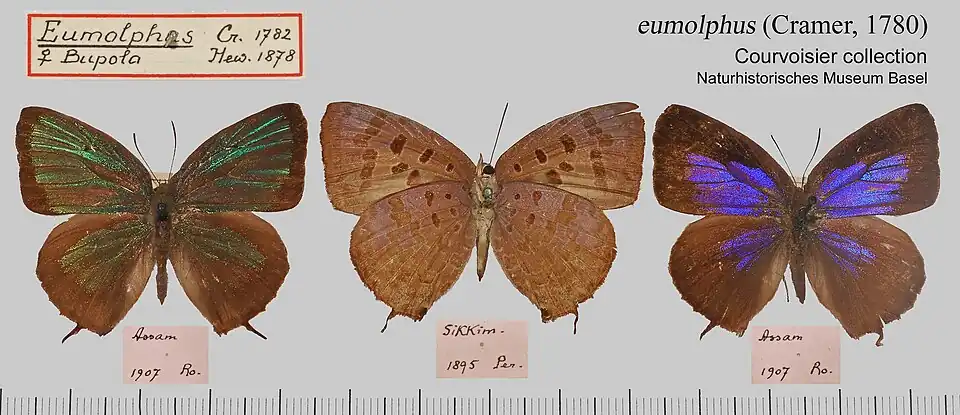 - Arhopala eumolphus (Cramer); Bethune-Baker, 1903: 104, pl. 2, fig. 17; Seki et al, 1991: 65, L231; Eliot, 1992: 285, 420, pl. 42, figs 20, 21, pl. 68, fig. 13, genit. 260; Treadaway, 1995: 76.