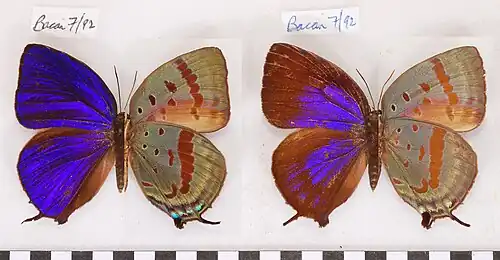 - Evans, W.H. 1957. A revision of the Arhopala group of oriental lycaenidae (Lepidoptera: Rhopalocera) Bulletin of the British Museum (Natural History), Entomology 5(3): 85–141. BHL Reference page.