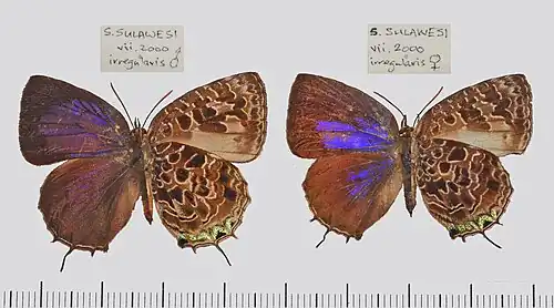 - Arhopala irregularis Bethune-Baker, 1903: 111, pl.2 fig.18; Vane-Wright & de Jong, 2003: 122.