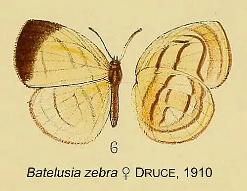 - Batelusia zebra Druce, 1910: 368, pl.34, fig.6.; Stempffer, 1967: 79, fig.77.