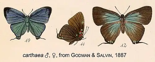 - Thecla carthaea Hewitson, 1868: 15; Godman & Salvin, 1887: 24, pl.50, figs 10-12.