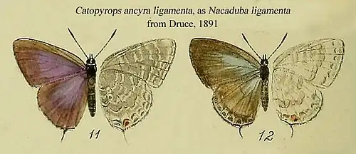 - Nacaduba ligamenta Druce, 1891: 361, pl. 31, fig. 11, 12.