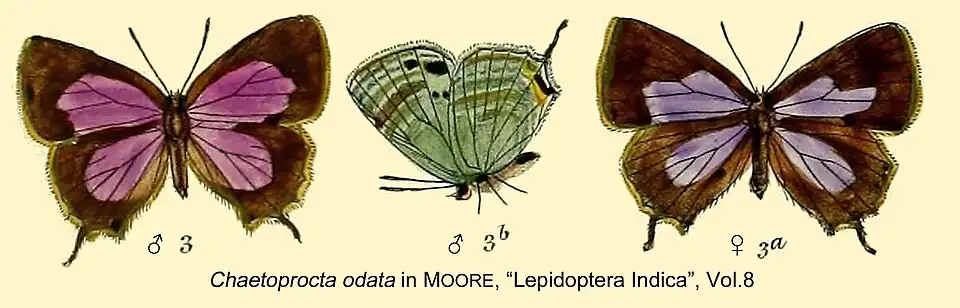 - Chaetoprocta odata (Hewitson); de Nicéville, 1890: 312, pl.27 fig.204 ♀; Moore, 1910: 279; pl.705 figs 3,3a,3b; Eliot, 1973: 477, ♂ genit.