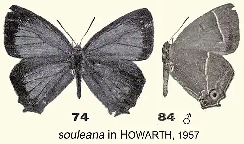 - Neozephyrus souleana (Riley); Howarth, 1957: 258, fig.24 ♂ genit., figs 74,84 Holotype.