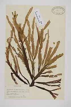 - Hooker, J.D. & Harvey, W.H. 1845. Algae Novae Zelandiae; being a catalogue of all of the species of algae yet recorded as inhabiting the shores of New Zealand, with characters and brief descriptions of the new species discovered during the voyage of H.M. discovery ships "Erebus" and "Terror" and of others communicated to Sir W. Hooker by D. Sinclair, the Rev. Colenso, and M. Raoul. The London Journal of Botany 4: 521–551. BHL Reference page. : 540–541