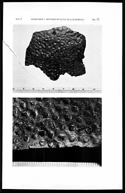 - Dickinson, M.G. 1945. Sponges of the Gulf of California. Allan Hancock Pacific Expeditions. Los Angeles, Calif.: University of Southern California Press. 11(1): 1–55; pls. 1–97. Online BHL Reference page.