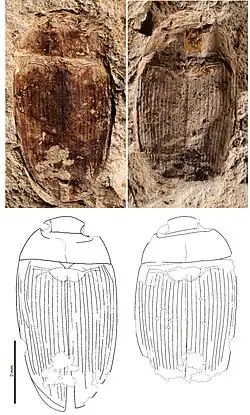 - Description: 'fossil of the whole beetle in dorsal view, head, pronotum and elytra almost completely preserved; appendages missing'