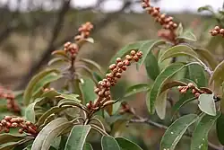 Afrikaans: Laventelbos, Laventelkoorsbessie, Harige laventelkoorsbessie, Bergboegoe, Korannaboegoe, Kalahariboegoe, Booghout, Boeghout, Rekstokbos, Makwassi, Maquassiboom
