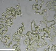 Description: Macroscopic growth in the form of dark greenish mat in rocks in the shore of a brackish lake. Mats appear rough in texture and have lot of colourless slimy mucilaginous material associated with them (Panou & Gkelis, 2021). Older mats on exposure to sunlight appear puffier, thicker and take up an almost light brownish colour (Panou & Gkelis, 2021). Laboratory grown cultures exhibit typical light brownish colour, dark blue-green in younger stages. The trichomes have mucilaginous sheath all around them and even at the ends (Panou & Gkelis, 2021). Vegetative cells appear granular with gas vesicles; usually barrel shaped to spherical/cylindrical with terminal cell slightly tapered; 2.5-6.5 μm in length to 3.1-5.6 μm in width (Panou & Gkelis, 2021). Trichomes are irregular waived to coiled, cells are characteristically constricted at their ends, thus being the defining feature of this strain (Panou & Gkelis, 2021). Heterocytes prominently visible; terminal and intercalary; spherical to oblong with clear polar nodules; 6.5-8.0 μm in length to 3.0-6.8 μm in width (Panou & Gkelis, 2021). Akinetes were not observed (Panou & Gkelis, 2021).