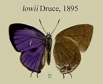 - Arrhenothrix lowii H. H. Druce, 1895: 596, pl. 33, fig. 2 ♂.