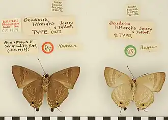 - Deudorix littoralis Joicey & Talbot, 1916: 83; Parsons, 1991; Parsons, 1998: 405.