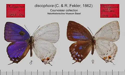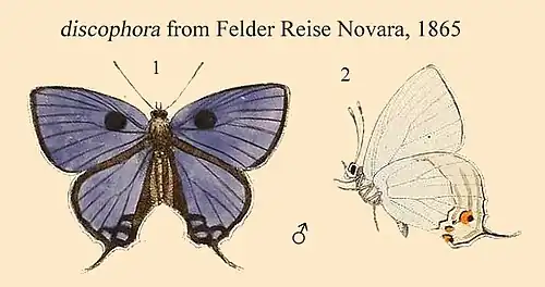 - Myrina discophora C. & R. Felder, 1862: 290; Felder, 1865, pl. 30, figs 1, 2; Hewitson, 1869, Lycaenidae (4): (Suppl.) 4.