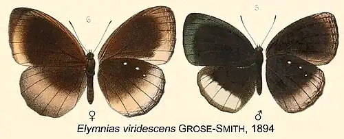 - Elymnias viridescens Grose-Smith, 1894: 365, pl.12 figs 5–6. TL: Humboldt Bay (Indonesia: Papua, Jayapura, Yos Sudarso Bay). BMNH.