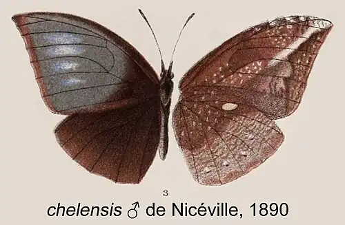 - Elymnias chelensis de Nicéville, 1890: 200, pl.D fig.3; Wei et al, 2017.