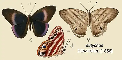 - Eurygona eutychus Hewitson, [1856]: Eurygona V, text, figs 44-46.