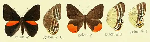 - Papilio gelon Stoll, [1787]: 23; pl.V, figs 2,2B.