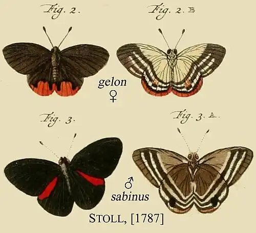 - Papilio sabinus Stoll, [1787]: 44, pl.IX figs 3,3A. HT ♂.