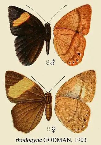 - Euselasia rhodogyne rhodogyne (Godman); Bridges, 1994: VIII.400; Lamas, 2004: 143.