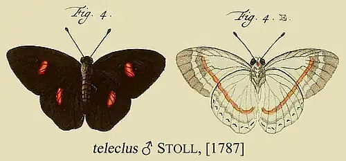 • Papilio teleclus Stoll, 1787: 24, pl.5 figs 4,4E.