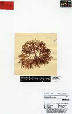 - Type: Ivan M. Johnston (no.27); June; Growing on rocks in the upper sublittoral belt. CAS 1343. Isotype: sheet 69, including slides 210, 1072-1074, HAHF.