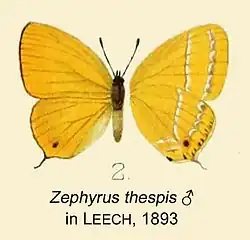 - Zephyrus thespis (Leech); Leech, 1893: 388, pl.28 fig.2 ♂.