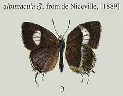 - Horaga albimacula (Wood-Mason & de Nicéville); de Nicéville, [1889]: 284, pl.14, fig.9; Corbet, 1941:48; Cowan, 1966: 126, pl.1, figs.11,12, pl.2, fig.20 genit.