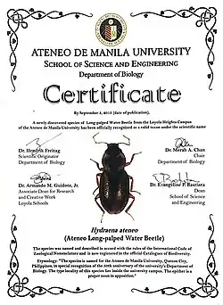 - Freitag, H. 2013: Hydraena (Hydraenopsis) ateneo, new species (Coleoptera, Hydraenidae) and other aquatic Polyphaga from a small habitat patch in a highly urbanized landscape of Metro Manila, Philippines. ZooKeys, 329: 9–21. DOI: 10.3897/zookeys.329.5955 Reference page.