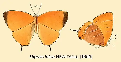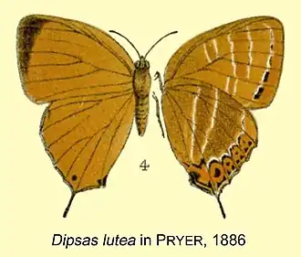 - Dipsas lutea Hewitson, [1865]: 67, pl.26 figs 9-10; Pryer, 1886: 13, pl.4 fig.4.