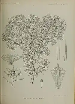 - Dicoma cana Balf.f. in Proc. Roy. Soc. Edinburgh 11: 841 (1882)