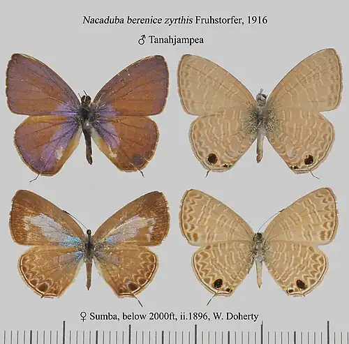 - Nacaduba berenice zyrthis Fruhstorfer, 1916: 128; Tite, 1963: 78; Cassidy, 1990: 234.