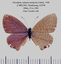 - Nacaduba calauria malayica Corbet, 1938: 137, pl. 1, figs 4, 33; Tite, 1963: 86; Seki et al, 1991: 43, pl. 26 L137.