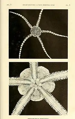 - Ziesenhenne, F.C. 1935. A new brittle star from Galapagos Islands. Allan Hancock Pacific Expeditions 2(1): 1–4, Plate 1. BHL. Reference page. [original description p. 1-3, pl. 1 figs. 1-2]