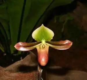 Paphiopedilum mastersianum (Rchb.f.) Stein, Orchid.-Buch: 477 (1892)