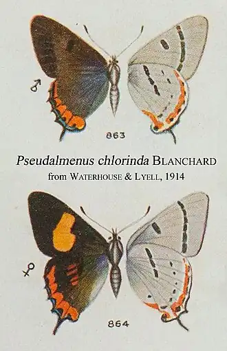 - Pseudalmenus chlorinda chlorinda (Blanchard); Waterhouse & Lyell, 1914: 113, figs 863,864; Waterhouse, 1928: 411, plate. D'Abrera, 306.