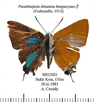 - Pseudotajuria donatana bangueyana (Fruhstorfer); D'Abrera, 1986: 616; Seki et al, 1991: 92, pl. 62 L334.