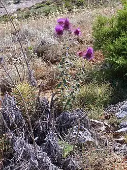 español: cabeza de polla, cabeza de pollo, cardo montés de Jaén, cardo perruno, cardo prieto, cardo sanjuanero, cardo yesquero, yesca