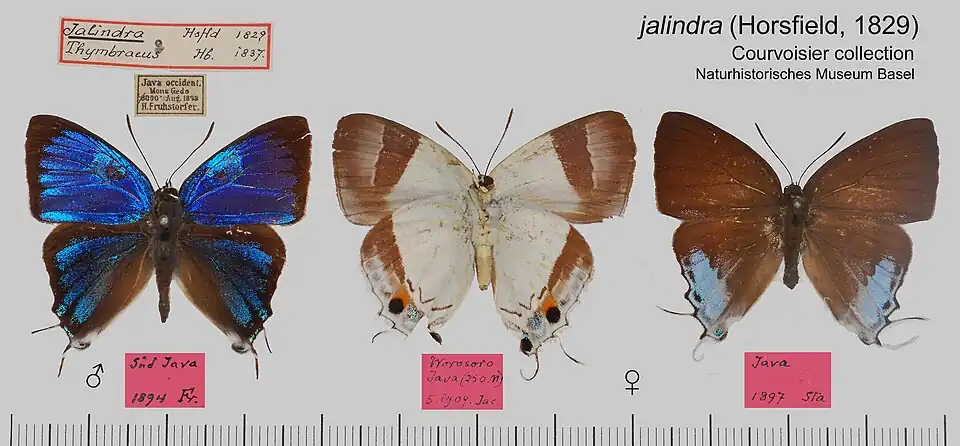 - Tajuria jalindra (Horsfield); Druce, 1895: 599; Fruhstorfer, 1912: 209; Evans, 1927: 184.